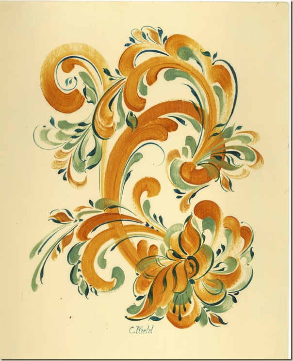 This one's done on matboard. I'm working with oils now, which provide different challenges than the acrylics. They smudge more, because they dry so slowly. I'm learning. The oils dry with a nice shiny finish, and are quite bright on a wooden surface. On matboard, however they dry flatter and more quickly. I can claim this design as my own. Though I was looking at a photo of another design, I really didn't come that close to the other one. It was much more involved than this one. I may try again next class. Mainly I'm trying to vary the position of the basic scrolls and the shapes of the flowers.